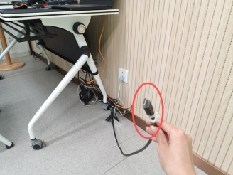 3. ①需要用提词器念稿的老师,将文稿用自带的笔记本电脑(word或ppt)打开,笔记本连接到桌子下面提词器连接线。