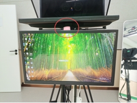 2. 站在大屏幕前方,面对摄像机,用脚快速但有力地踩一下地上的录制开关,看反监屏上方的红灯亮起,说明正在录制。