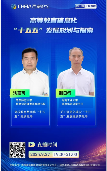 2025年9月27日,我校信息化办公室主任谢日行应邀在中国高等教育学会教育信息化分会主办的公益直播栏目《CHEIA百家论坛》上,作了题为《关于信息化建设“十五五”发展规划编制的思考和实践》的专题报告。