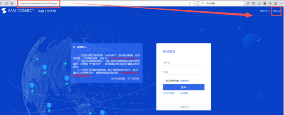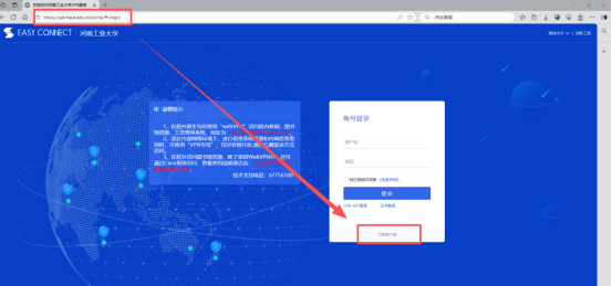 答:在浏览器地址栏输入“vpn.haut.edu.cn”进入VPN登录界面,点击登录框下面的下载客户端,安装后使用统一身份认证账号密码登录即可。安装时需要填写的服务器地址为:vpn.haut.edu.cn。(账号密码同“云上工大”)