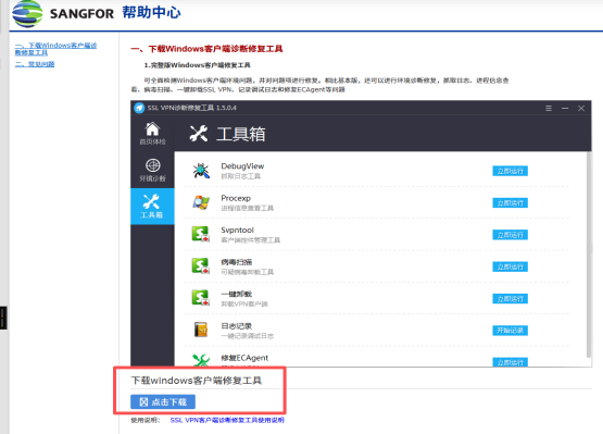 答:(1)在浏览器地址栏输入“vpn.haut.edu.cn”进入VPN登录界面,点击右上角的诊断工具,下载客户端修复工具,修复后重新登录即可。