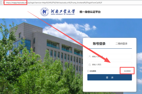 (2)在浏览器输入“mapp.haut.edu.cn”进入统一身份认证登录界面,点击忘记密码,根据提示修改密码重新登陆即可。(如无法自助修改密码,请电话联系:67756236)